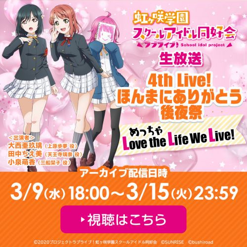 「ラブライブ!虹ヶ咲学園スクールアイドル同好会生放送 4th Live!ほんまにありがとう後夜祭 めっちゃLove the Life We Live!」アーカイブ配信決定!