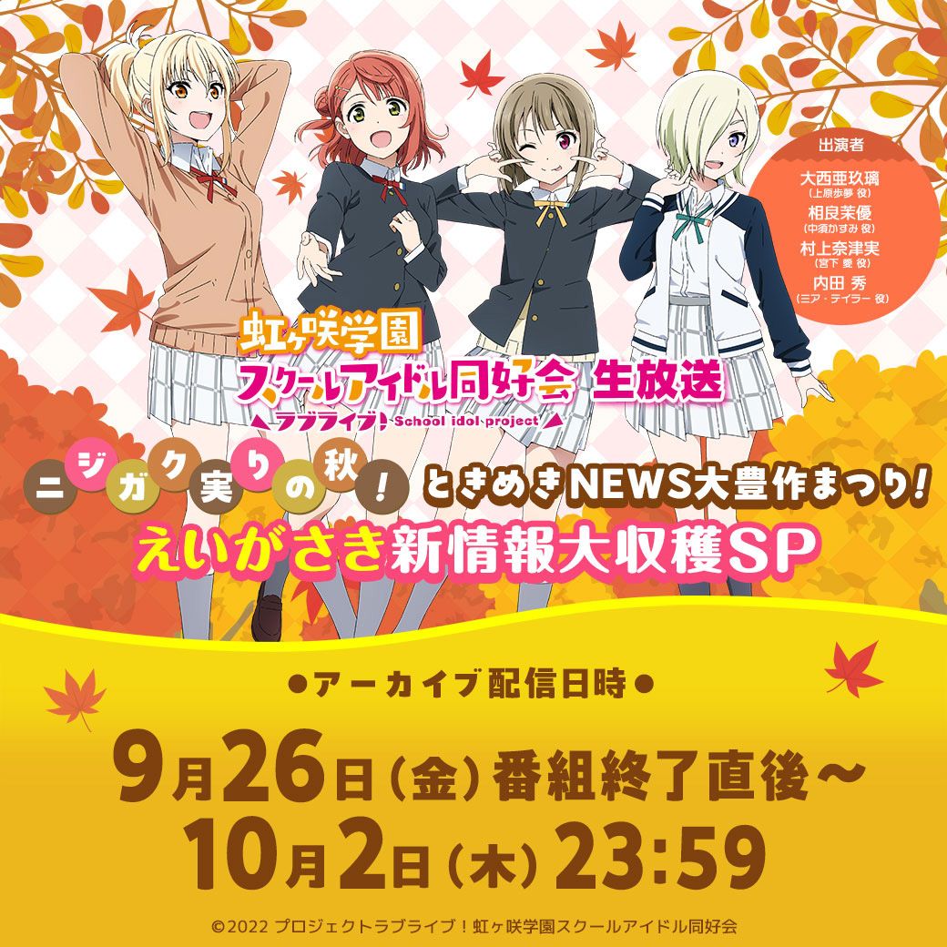 「ラブライブ!虹ヶ咲学園スクールアイドル同好会生放送 ニジガク実りの秋!ときめきNEWS大豊作まつり!えいがさき新情報大収穫SP」アーカイブ配信のお知らせ!